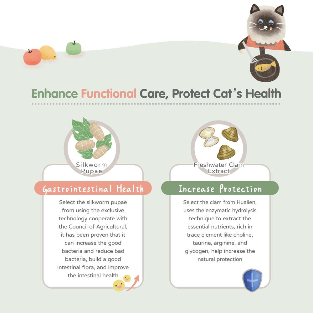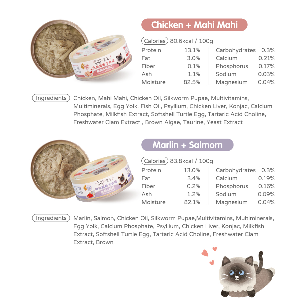 Ingredients: Marlin, Salmon, Chicken Oil, Silkworm Pupae, Multivitamins, Multiminerals, Egg Yolk, Calcium Phosphate, Psyllium, Chicken Liver, Konjac, Milkfish Extract, Softshell Turtle Egg, Tartaric Acid Choline, Freshwater Clam Extract, Brown Algae, Taurine, Yeast Extract