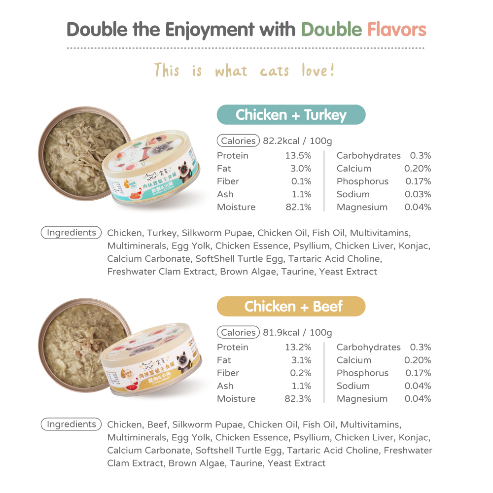 Ingredients: Chicken, Turkey, Silkworm Pupae, Chicken Oil, Fish Oil, Multivitamins, Multiminerals, Egg Yolk, Chicken Essence, Psyllium, Chicken Liver, Konjac, Calcium Carbonate, SoftShell Turtle Egg, Tartaric Acid Choline, Freshwater Clam Extract, Brown Algae, Taurine, Yeast Extract