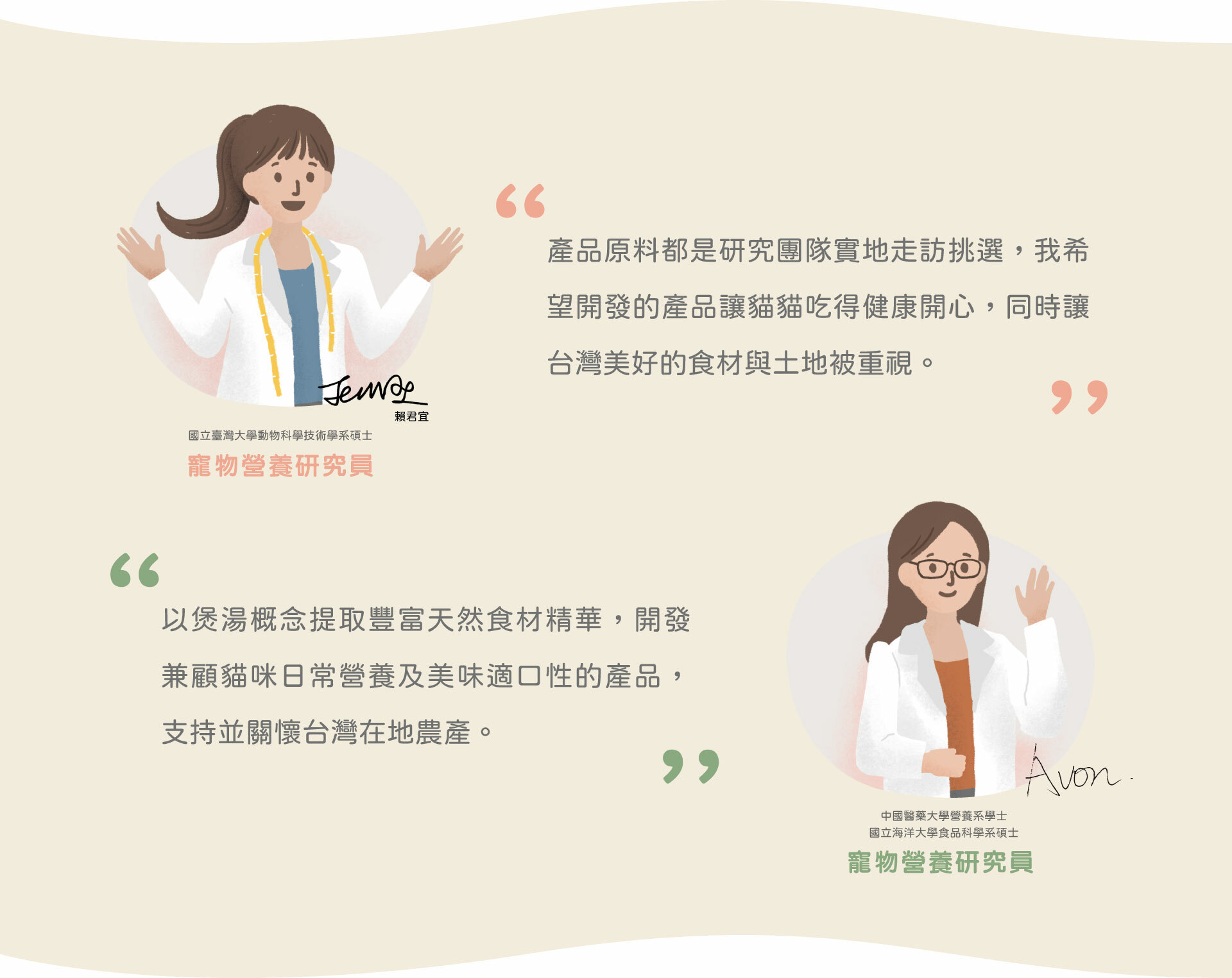 我們是由營養X動物科學專家創立的團隊,結合臺灣大學、海洋大學的動物營養、獸醫師與食品科學專家,為了讓伴侶動物與野生動物能共存,我們開發出第一支生態護育貓食。